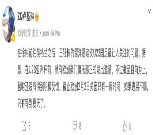 目前,U23国足队长徐彬已经正式加盟英超狼队,而此前王博豪早已经登陆荷乙联赛闯荡,并且有了不错的出场时间。